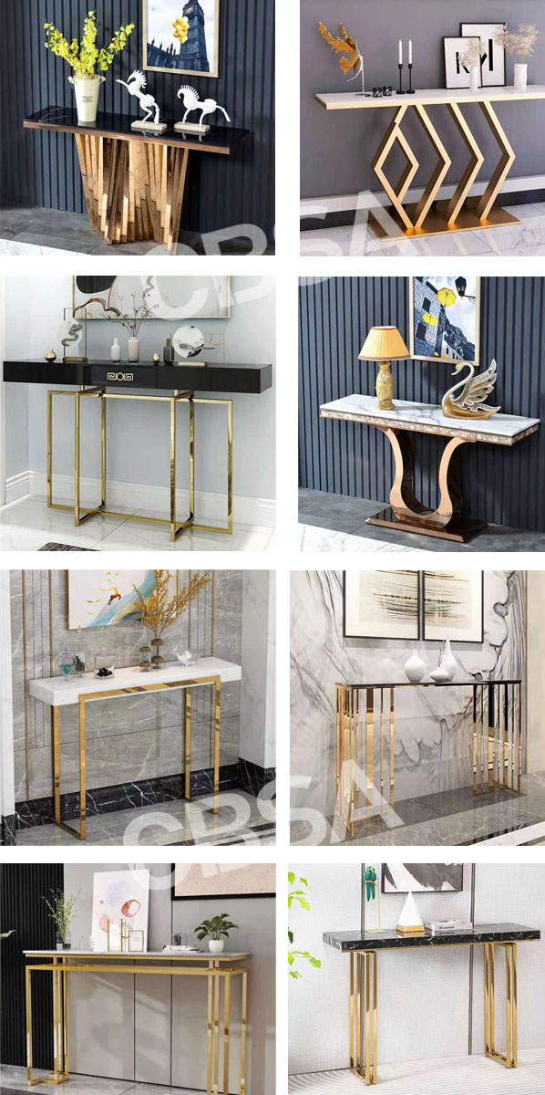 SS villa furniture console table China's professional hotel furniture manufacturer, including home console table, gold console table series, hotel luxury stainless steel table customization service. Hotel table,console table,home console table,luxury SS furniture manufacuter China stainless steel metal furniture manufacturer, the perfect combination of metal bracket and soft bag or marble, highlighting the artistic style of light luxury, coffee table, dining table and chair, TV cabinet,Entrance Cabinet,dining table,Dining chair,Wine cabinet,Barstool,Sideboard and other hotel household items, various specifications can be customized to meet your needs and decorative applications style.